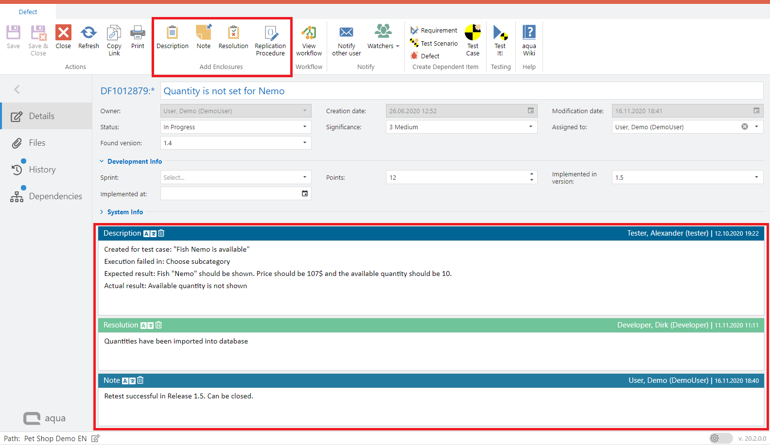 Using the ribbon bar of a defect, you can add Description fields, Note fields, Resolution fields or Replication Procedures to the defect. These are added below the description and are marked with a timestamp and the editor to allow discussions between the users.