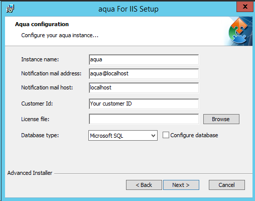 Click on Next. Enter the required data according to your SQL-Instance. This data can also be changed afterwards. Click on Next, read the hints and click on Next. The aqua server is being installed now. Finally, you will receive the following message: