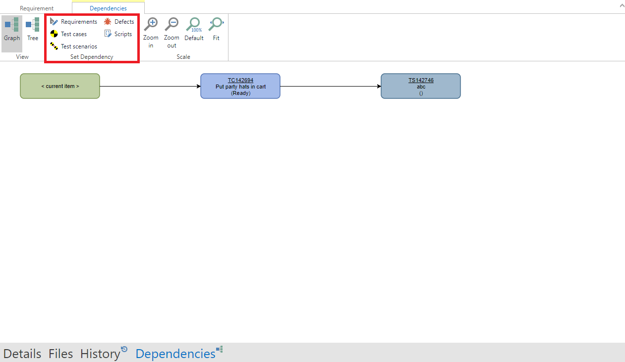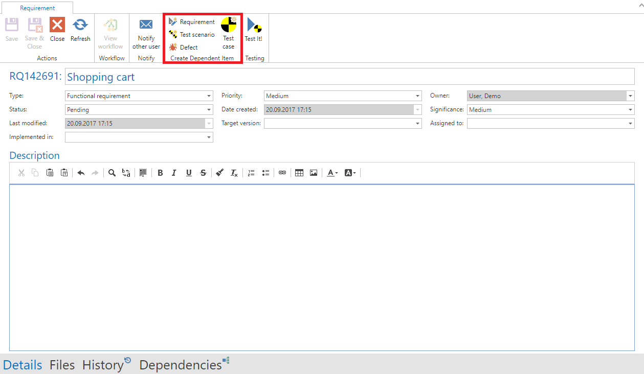 You can also create new dependent items from existing items. To do so, open an item and select an item type from the 'Create Dependent Item' section in the ribbon. A new tab with a new item will open and a dependency is added.