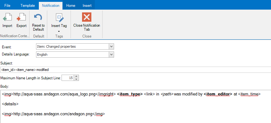 The language (german or english) of a notification can be defined in the aqua project configuration. The following screen illustrates an example.