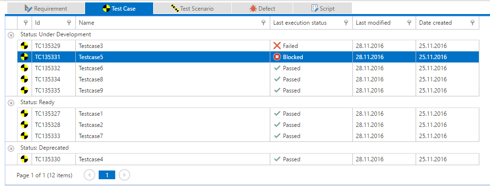 In this scenario, we have 9 test cases, each with a different workflow status and Last execution status.