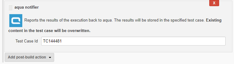 Then go to your Jenkins Job, add a new Postbuild Action called aqua Notifier” and enter the Id of your aqua test case.