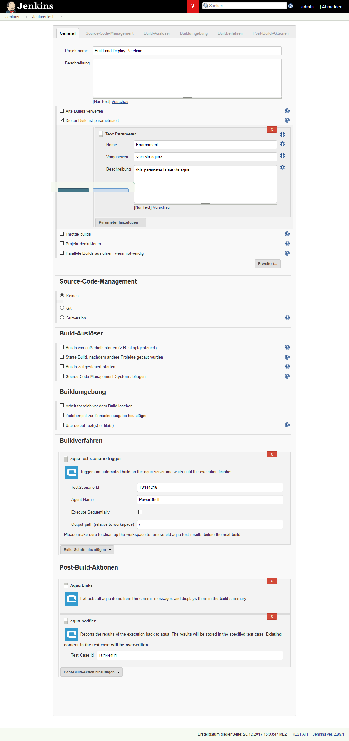 Then go to your Jenkins Job, add a new Postbuild Action called aqua Notifier” and enter the Id of your aqua test case.