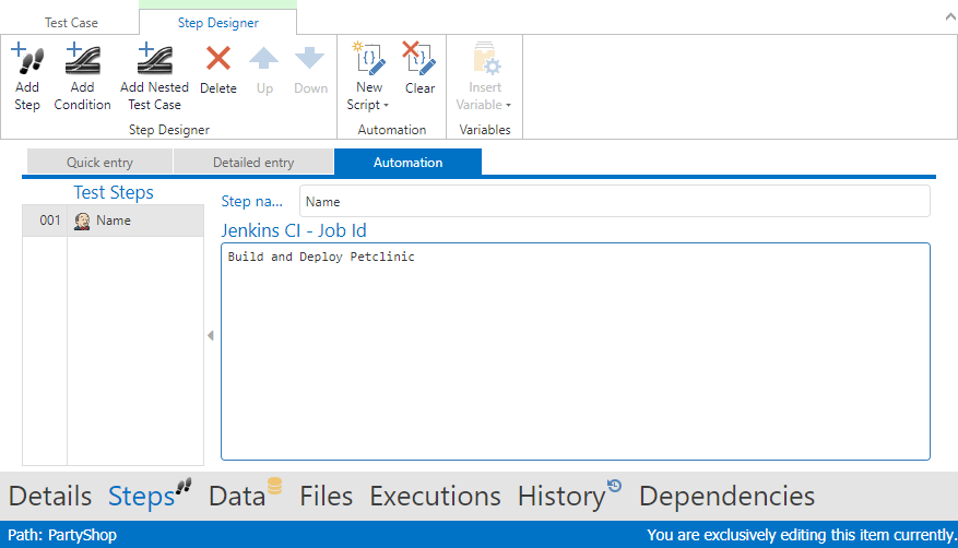 Note: A Jenkins job can be parameterized. If you want to overwrite a specific parameter, e.g. Environment, you can parameterize your aqua test case (see Data section in gray bottom bar. When triggering the given Jenkins job via aqua, the given value, e.g. Approval, is set properly in Jenkins.