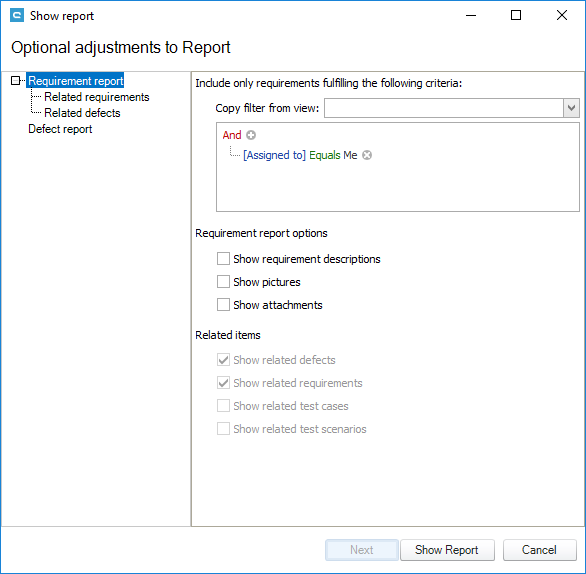 In order to improve performance of report creation it is important to understand the difference between server-side filtering and report-side filtering. Server-side filtering is done when a user starts to generate a report. The window below shows where a user can set filters ([Assigned to] equals Me). This is done on the server before data is send to the client (or the report respectively). It allows you to decrease the amount of data sent to the report.