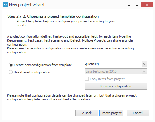A project configuration can be shared. That means that projects always have the same configuration as the master project. All configurations have to be made in the master project and cannot be changed later in the linked project. Therefore choose the option Use shared configuration in the project wizard and select a master project. This is described in the following screen.