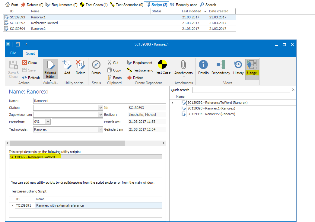 To simplify such references, you can use so-called utility scripts in script elements. These are additional script elements which can be added to scripts via the 'Usage' button. Alternatively, place the reference script in the first test step.