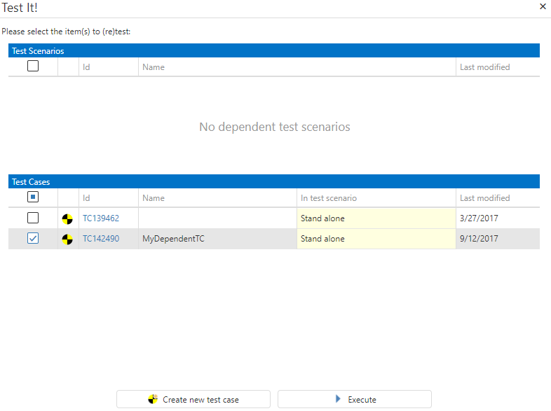 The Test It! feature allows you to instantly test elements with related test cases or scenarios. To do so, open an element, e.g. a requirement, with related test cases or test scenarios. Click on the button on the ribbon. If no test case or test scenario is specified, a new window will open and you can define and execute a new test case. If exactly one test case or test scenario is connected, test execution will start immediately. If more than one test case or test scneario is related to the given item, a window will open, where you can select a related test case or test scenario and execute this.