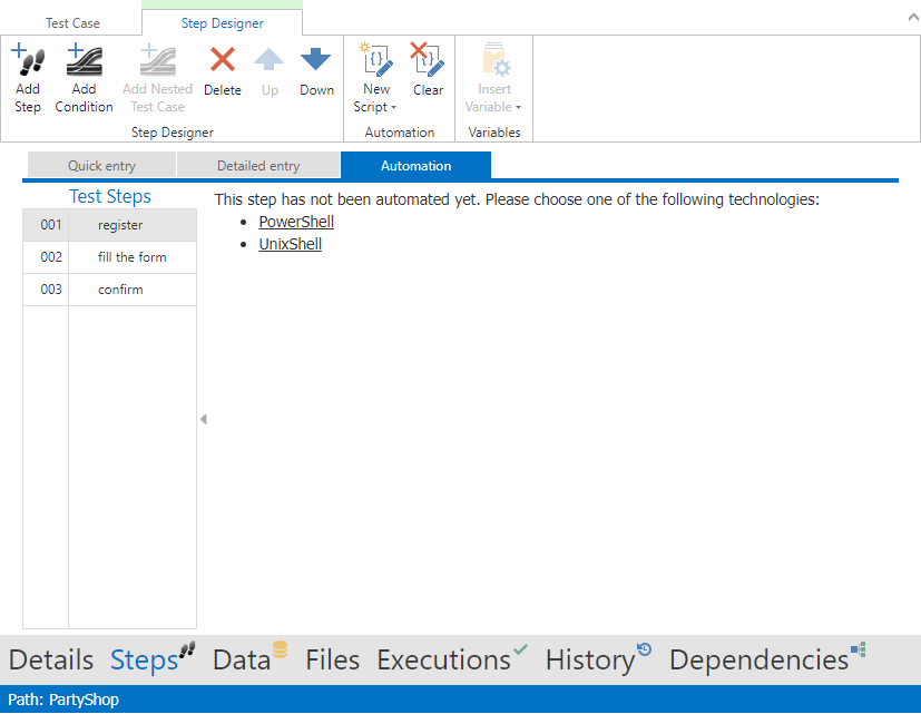 In order to run a UnixShell-Script in aqua, create a new test case, open Step Designer and select tab Automation. Select the test step (click the empty space of the given step) and add a new UnixShell-Script.