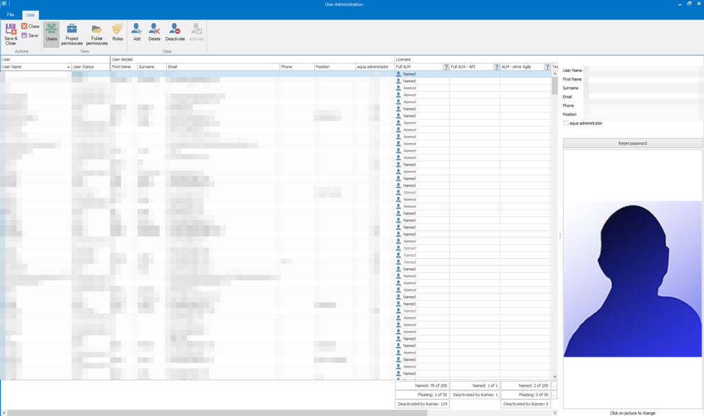 For adding a new user press button "Add" from the Ribbon Bar on top of the window. A user dialog will allow you to enter user details, assign the corresponding license and add the user to a project. In order to use the