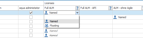 On the right hand side of the "Users" view, you can see all licenses that you have purchased, column-by-column. In order to assign a new license, you select the cell of the corresponding user and license directly in the data grid.