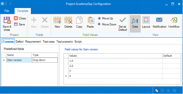 The values for Item version can be edited by using the corresponding buttons. In addition, a default value for all newly created elements can be set. Metric scales (e.g. 3.4 or 5.0) and non-metric code names (e.g. 4.0 beta, lollipop, jelly beans) can be used. To create a new version of an element, select this element in the navigation and select Create New Version in the context menu.