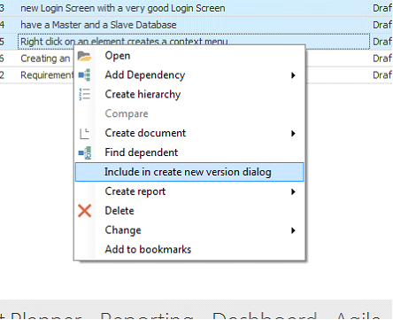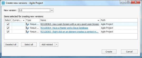 You can expand the choice of elements for the creation of a new version by selecting some more elements in the element browser and selecting Include in create new version dialog within the context menu.