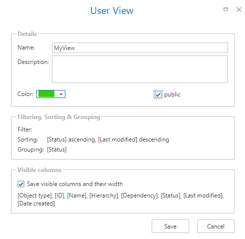 As soon as the view looks as expected, click 'New view'. A window will open where you can define the view, e.g. if it should be public or not. Public allows other users in the given project to see and apply your view accordingly.