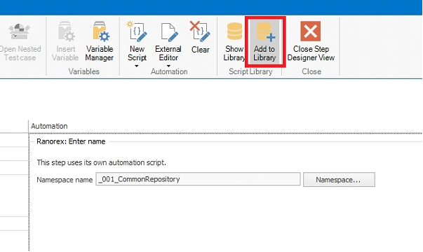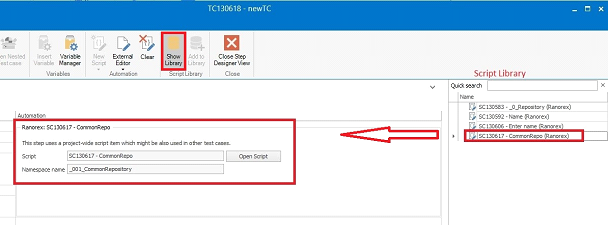 Now, we create a new test case and open the script library (Show Library button). Then, just drag the script to the white area in the test step.