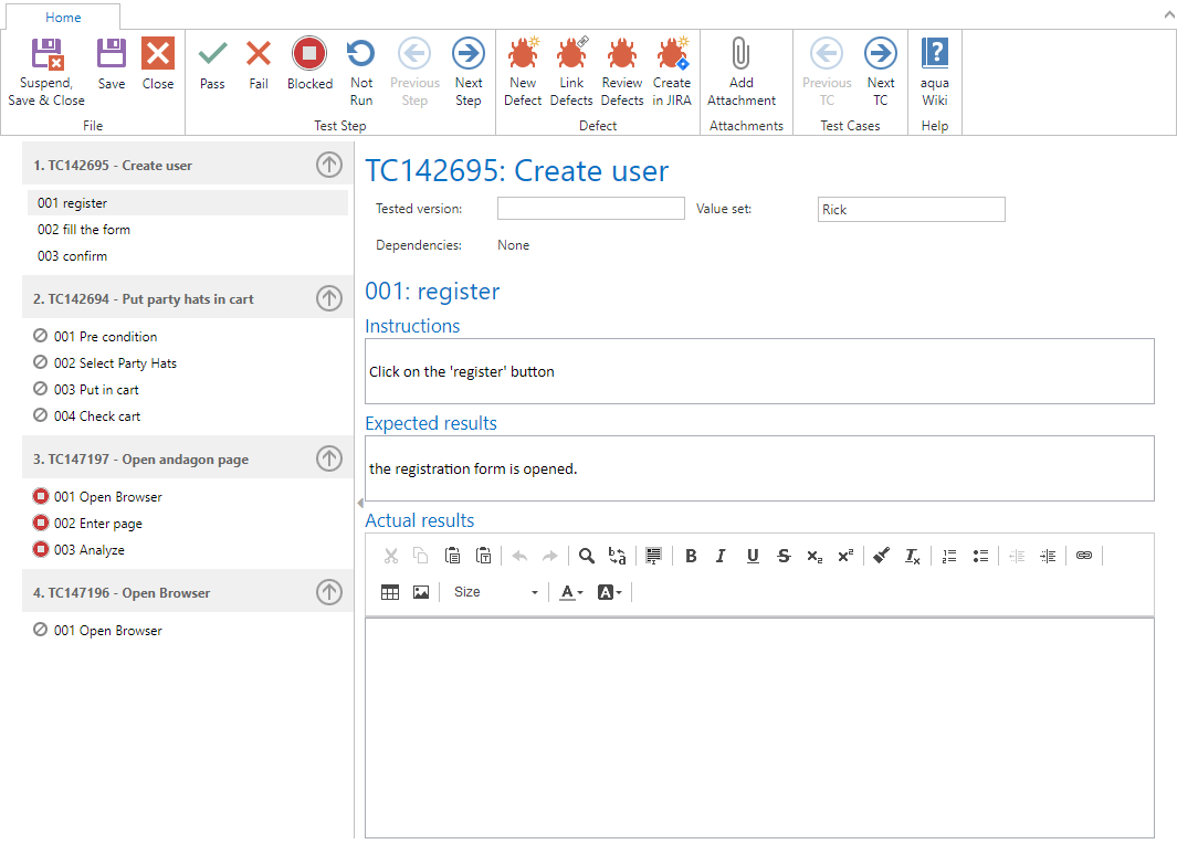 You can execute either a selection of test cases in your scenario, or the entire scenario. To execute the full scenario click 'Run all'. The execution window opens and you can execute each test case step by step.