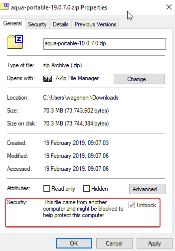 In order to unzip the portable version of the aqua client, you can easily use 7-zip. If you do not have 7-Zip, you can still unzip it using the windows default zip-tool. You have to mark the file as save. To do so, open the file properties by right-clicking the file and click the 'Unblock' checkbox: