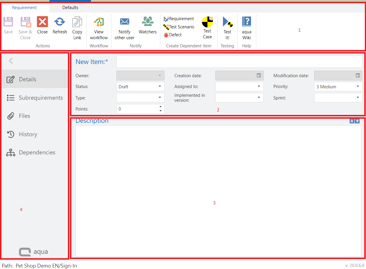 Field names can be altered, fields can be removed/added, default values and allowed value ranges can be defined and user-defined fields and field values can be added. Mandatory fields are marked with an asterisk and must be filled in order to save the item. These mandatory fields are set in the Workflow Configuration. The name is always a required field. Some fields are also filled in automatically, such as the creator or the creation date. Each item automatically gets a unique ID (across all projects) after creation, starting with RQ (Requirement), TC (Testcase), TS (Testscenario), or DF (Defect). In addition, when you create a new item, you can define a Template that will be used when creating additional items.