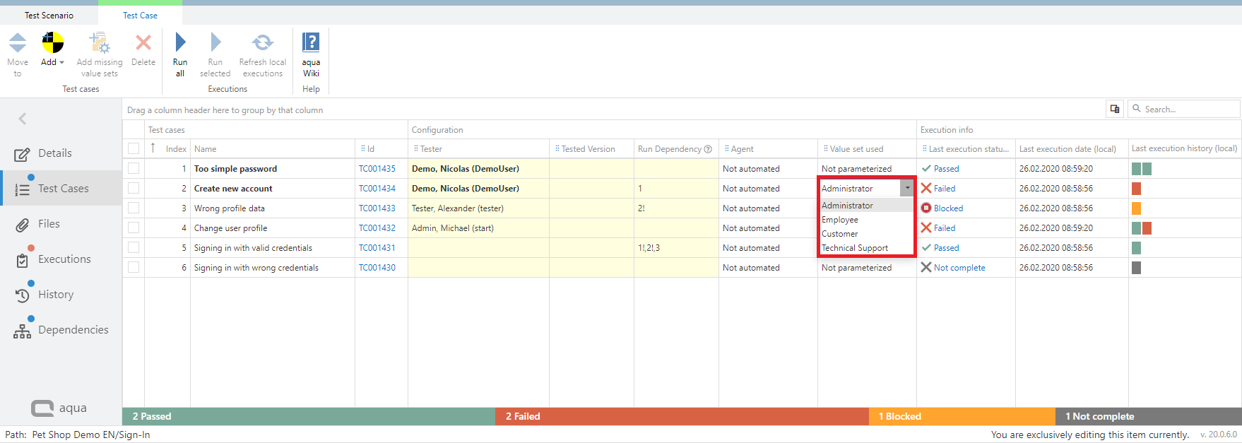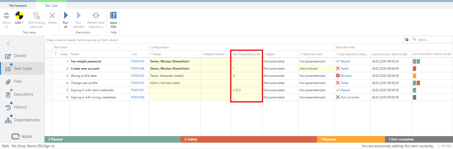 After your test cases are added to the test scenario you can define a run dependency for your test cases. This is for example helpful, if one test case needs to be passed before the next one can be executed. This means that if a single test case failed, none of the other test cases should be executed. To do so add values to Run Dependency column in the test cases view within a test scenario.