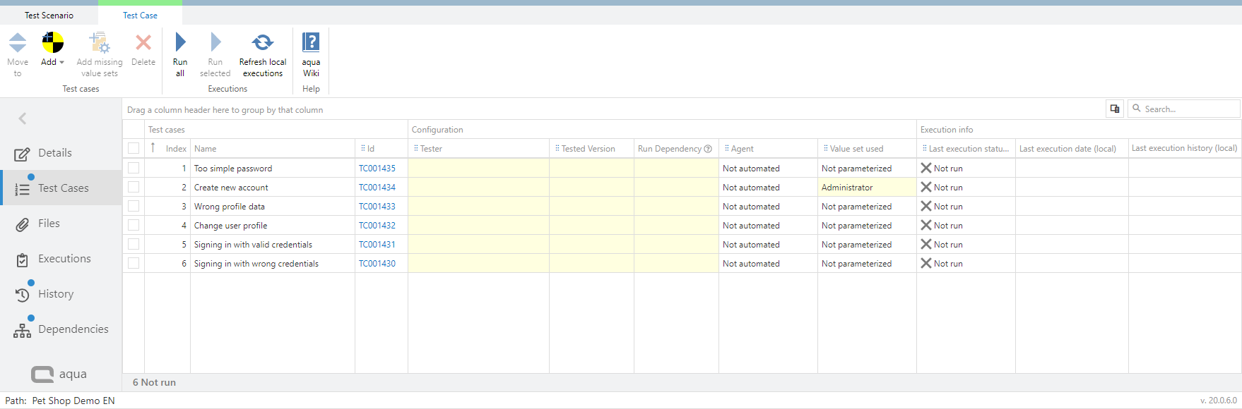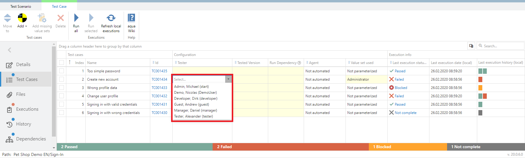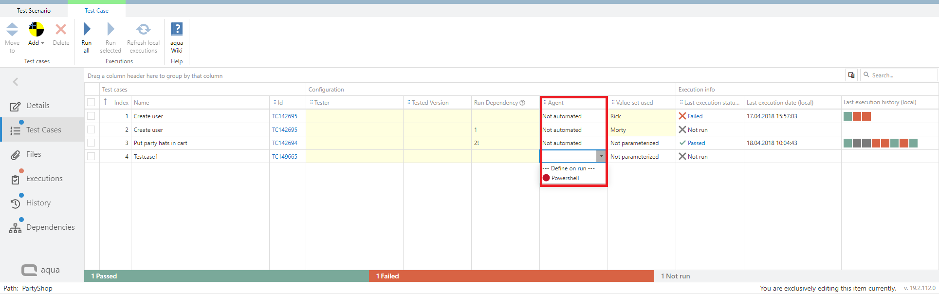 If your test cases in the test scenario are automated you can define an agent for the execution directly in the test scenario. If you do not define an agent here, the agent will be assigned in the execution automatically. aqua allows you to only select an agent which supports the technology the test case is automated with. To define agents, click on 'Test Cases'. Here you find a column 'Agent'. When you click in the cell where you want to define an agent, a drop down appears where you can select the agent. The agent defined in the scenario will be always considered first.
