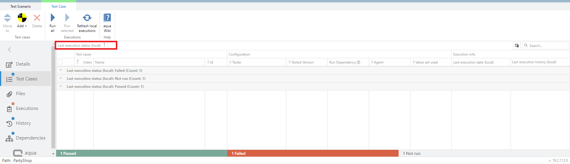 To find your test cases in your scenario as fast as possible, you can group the columns, or search for items. To group by one column, simply drag that column to the designated area and drop it there. You can also use the search field in the top right-hand corner to search and filter for text strings in the columns. The search applies not only to the Name column but also to the columns Id, Tester, Tested Version, Run Dependency, Agent, Value set used and Last execution status.