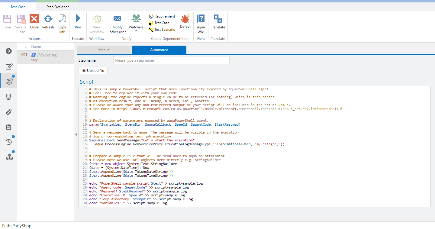 To add a PowerShell script to a test case, open a test case and navigate to step designer. Switch to the tab 'Automation'.