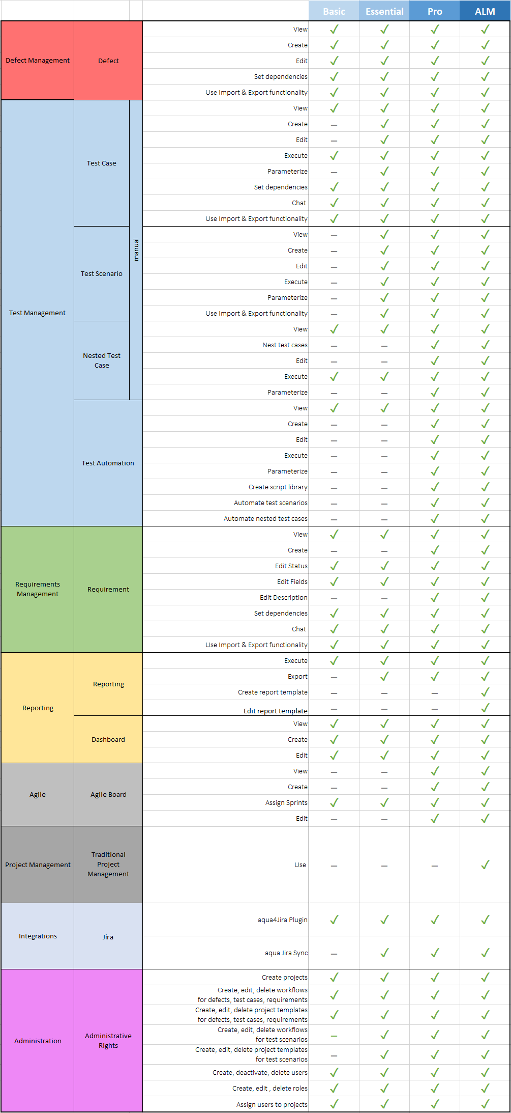 In the following you will find a detailed list of all the differences between the aqua licenses: