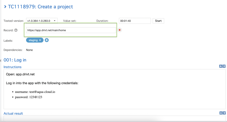To pass the data to aqua, you need to explicitly click the button ‘Save’ each time you finish testing the step. When you save the test step, it will appear under ‘Actual result’ in aqua in the active test execution.