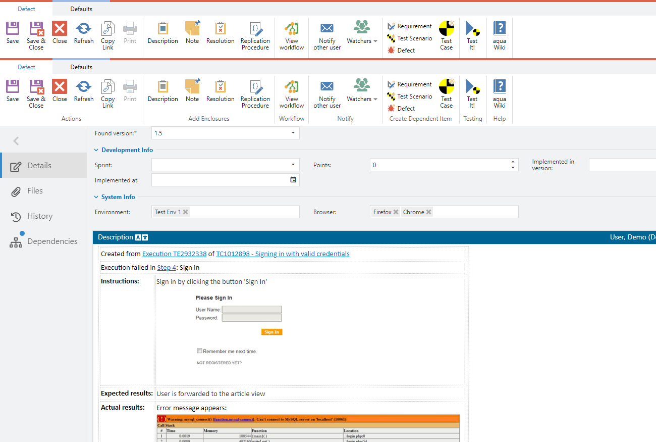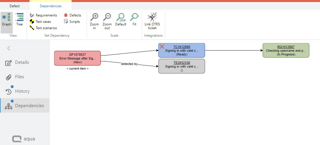 After saving the defect, you can analyze in dependencies how to reproduce the defect and which test cases have to be executed in order to specify that the functionality is fixed.