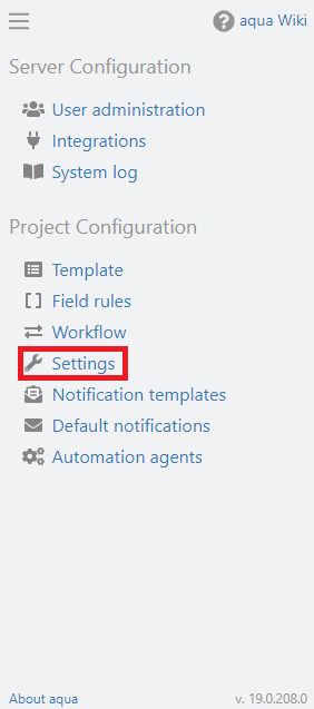You can define the expected result and actual results of test cases as mandatory. To do so select your project in the project browser and click on the configuration menu in the upper left corner of the aqua header . In the project configuration area select the entry Settings.