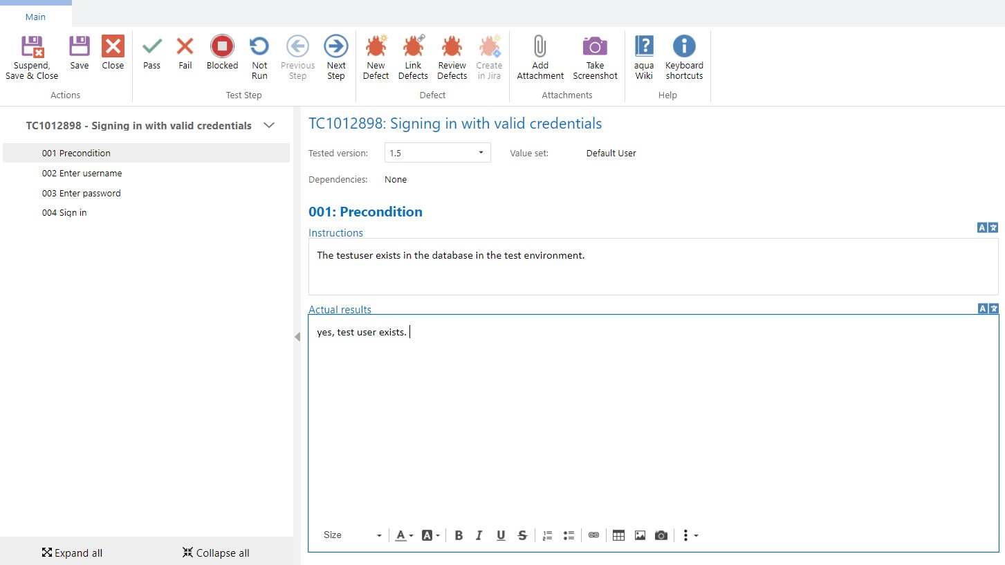 A new tab provides step-by-step the tasks to be performed in the given test case. The screenshot below shows a conditional step. Document the current behavior in Actual results. As in all description fields, the text can be formatted and tables or images can be added (via the toolbar in the lower part of the result field or by copy & paste).