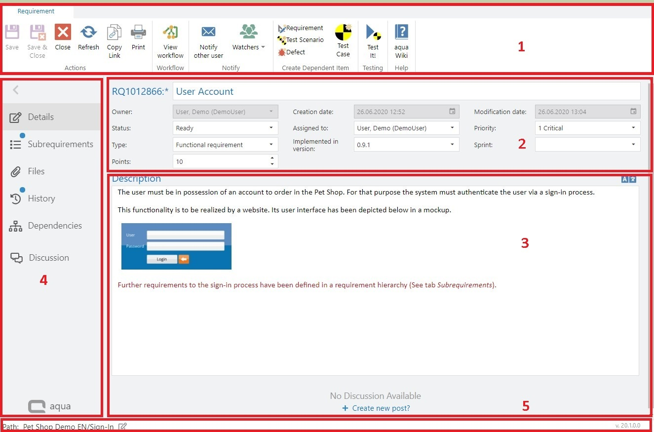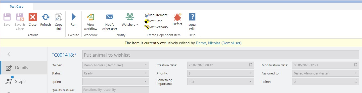 In the ribbon bar you have a quick access to different actions and functions for the opened item. Changes are only forwarded to the aqua server when you save them. As long as no changes are made, the buttons Save and Save & Close are inactive. You can also save or save and close your changes at any time using the familiar Shortcuts ctrl+s or ctrl+shift+s. With the Copy Link button a link to the selected Item is copied to the clipboard and can then for example be sent by e-mail. Print can be used to print all information about the element, such as the details, description, attachments, dependencies or even the history. The Workflow Preview shows you the configured workflow, if one exists. The workflow shows which status states are possible and which transitions are allowed. The workflow itself is activated and configured in the Workflow Configuration. In the Notification area you can notify other users directly from the item or add yourself as a watcher. In the Create Dependent Item area you can create other items with Dependencies to this item. With the Test It! button you can directly execute linked test cases for requirements and defects. Under Help you will find a link to the aqua Wiki where you are automatically directed to the chapter relevant for the selected item.