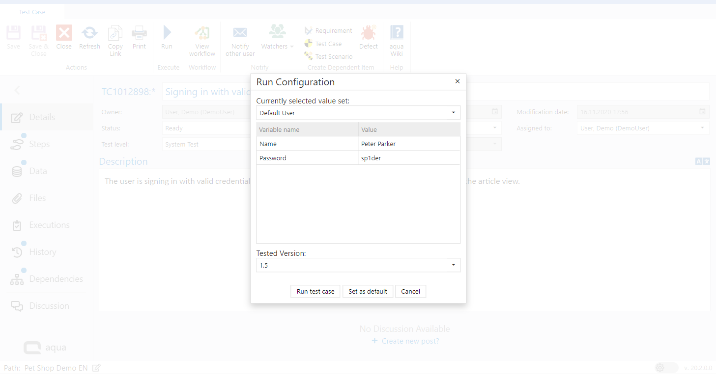 Clicking Run opens a configuration window where you can enter the tested version and choose the value set, if defined. The value set is described in section Variable Manager. Test execution labels can be used to track information about the System under Test and Test Environment. More details here. Start the execution by clicking Run.