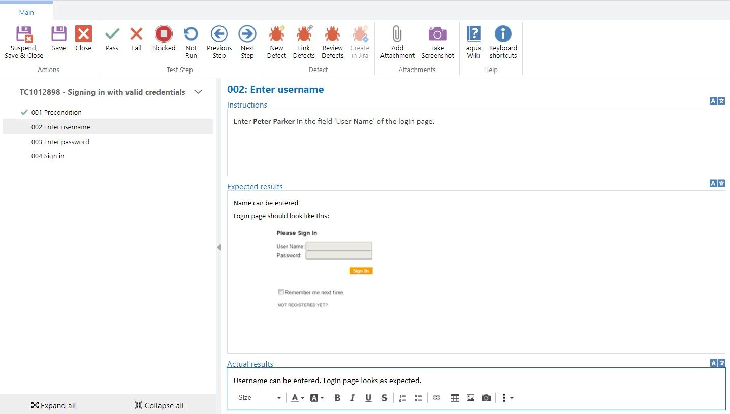 A new tab provides step-by-step the tasks to be performed in the given test case. The screenshot below shows a conditional step. Document the current behavior in Actual results. As in all description fields, the text can be formatted and tables or images can be added (via the toolbar in the lower part of the result field or by copy & paste).