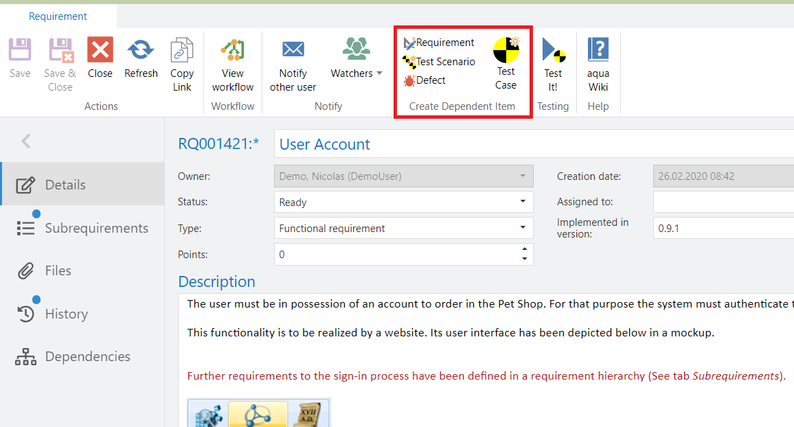 You can also create new dependent items from existing items. To do so, open an item and select an item type from the 'Create Dependent Item' section in the ribbon. A new tab with a new item will open and a dependency is added.