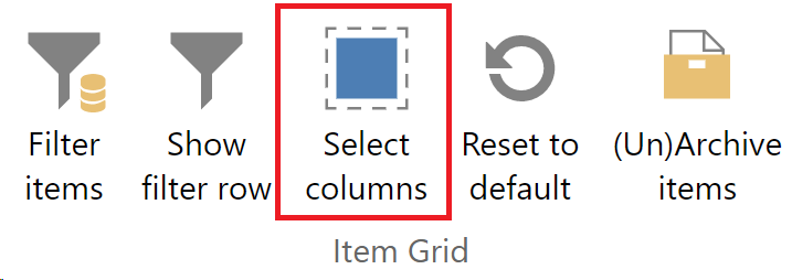 Filters, sortings and groupings can be saved in personal views. Use Show views in the ribbon of the item browser to access the views and create new ones. The views are divided into Mine, Public and Favorites. A click on a view applies the view. You can create as many views as you like and thus easily organize the items according to your needs at any time.