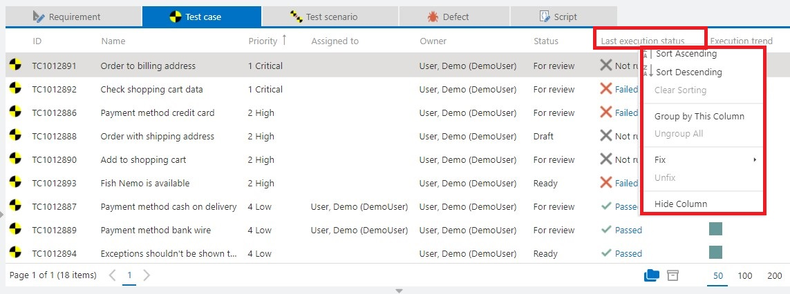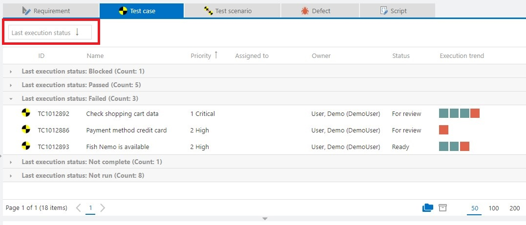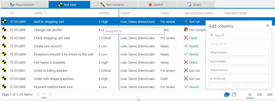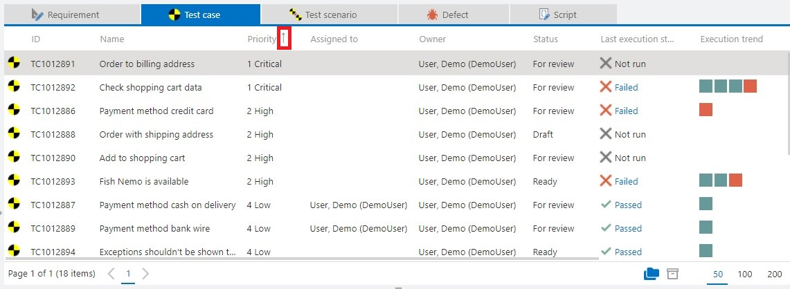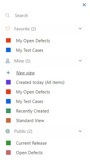 In addition, you can use the Search field to search for specific text strings. The search uses field names, IDs and descriptions in the selected project or folder. Views are combined automatically. Via Keep search queries the search text is also kept and applied to other item types (requirements, test cases, defects etc.) when switching to them.