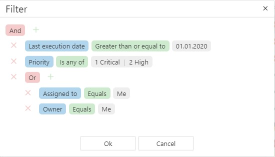 A new condition or a new group can be added using the plus sign. A group combines all conditions below this group with an And (all conditions apply), Or (at least one condition applies) or Not And or Not Or. For each condition you select the field you want to filter by, then the relational operator, which is dependent on the field type (e.g. is equal, is any of, starts with, ends with, is today etc.) and finally the value you want to filter by.