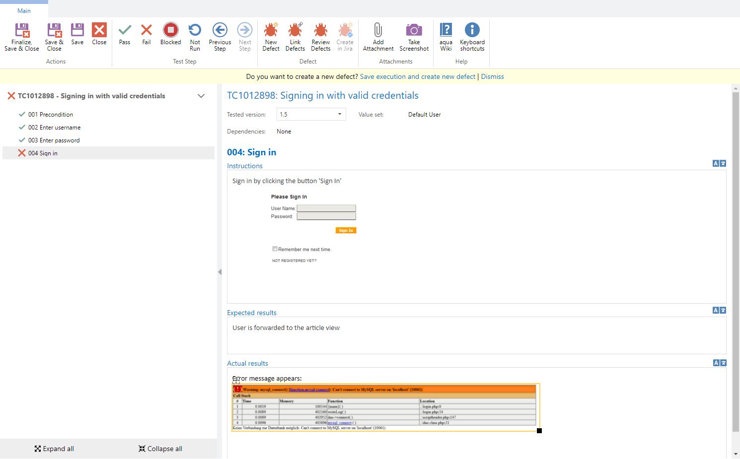 While executing a manual test case, you have the option to create a new defect by clicking on New Defect. You can also click on the info bar, which suggests you to create a new defect, that appears after you mark a step as failed.
