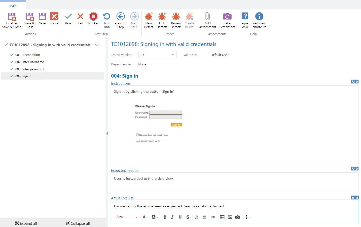 The second step is a test step. Here we find an Instruction and an Expected result as well as the Actual results field.