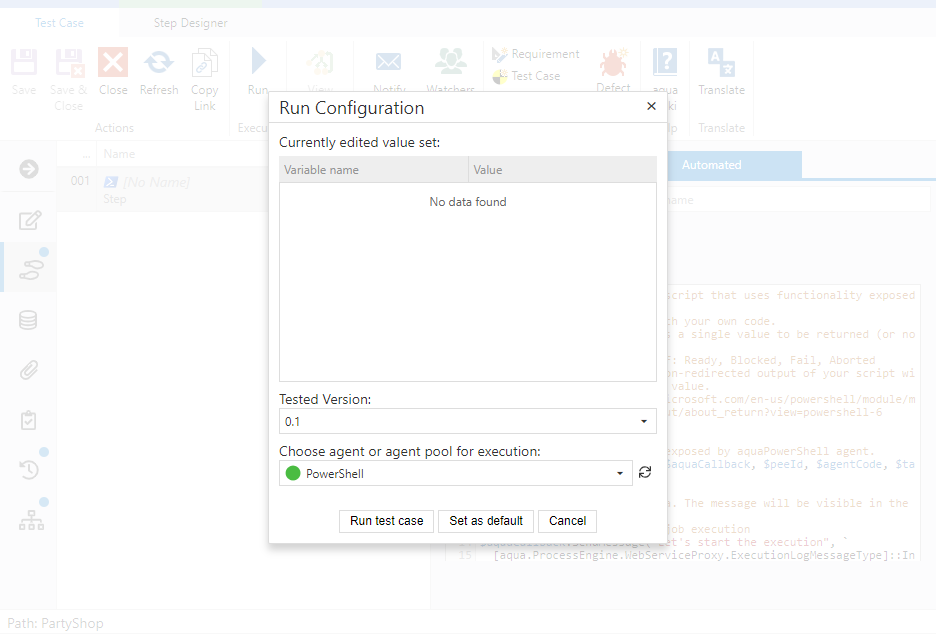 aqua allows to execute automated tests. The procedure to start an automated test is the same as for a manual test. You just click the Run button in a given test case. The following dialogue is supplemented with a section for Agent selection. The agent is responsible for executing the test. Red indicates that the agent is not available, green indicates an execution agent that waits for a task.