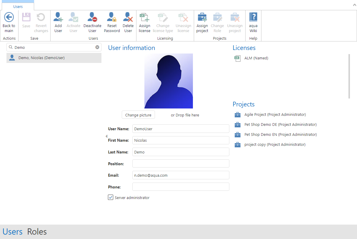 The User Administration page opens. Here you can manage your projects and users with different roles and permissions. In the Users tab you can add new users via a wizard, assign licenses or assign projects. Furthermore, you can get an overview of which project every user is working on. In the Roles tab you can manage all roles and create new roles.