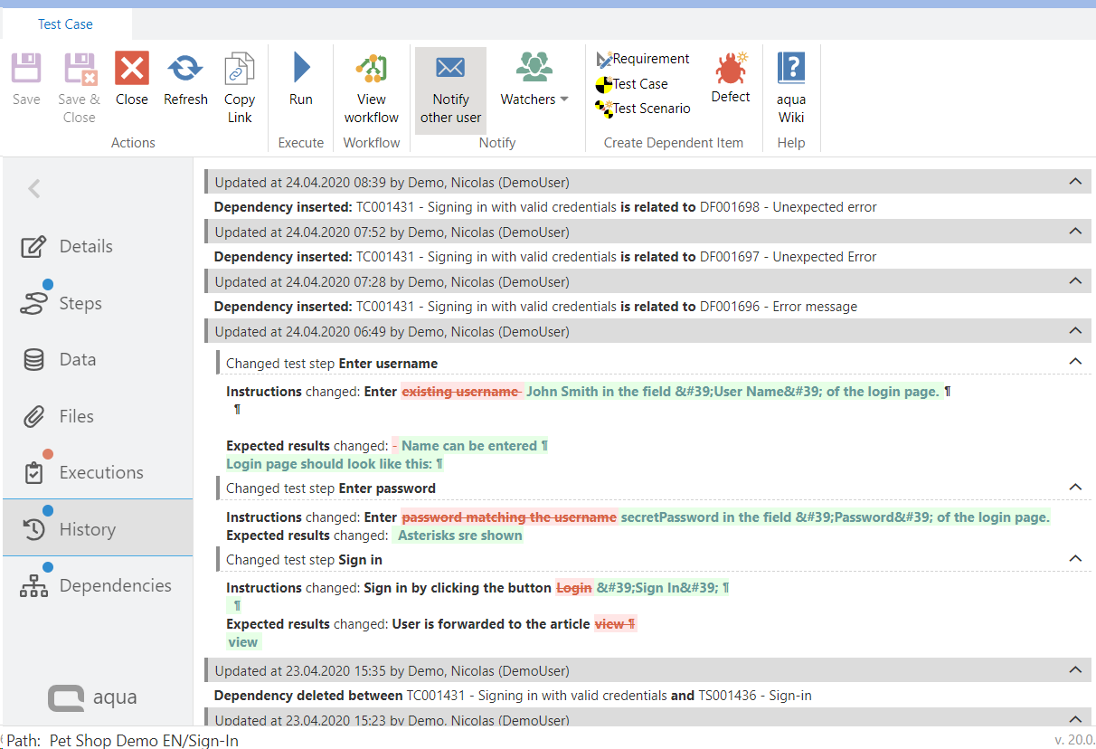 The entire history of an item's changes, such as creation, moving to another folder, setting dependencies, or changes in fields is displayed in the tab History. Both the timestamp of the change, the user who made the change and the change itself are saved. For changes in text fields, such as the description, red and green colors indicate which text passages have been removed or added. The history can also be displayed in the Item Preview of the item grid in the navigation.