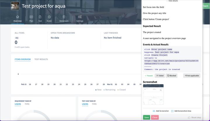 To pass the data to aqua, you need to explicitly click the button ‘Save’ each time you finish testing the step. When you save the test step, it will appear under ‘Actual result’ in aqua in the active test execution.