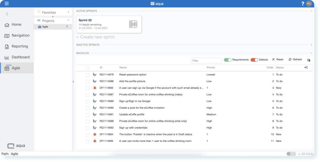 Each project now has a Backlog of all requirements, testcases and defects organised as one list of issues. It has all the necessary item attributes to give an instant overview and help you set priorities.