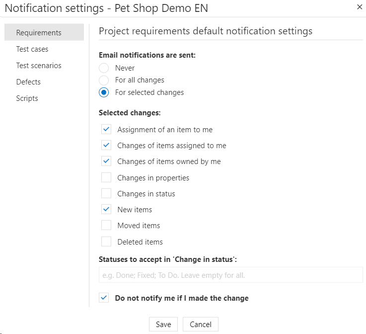 All notifications can be set separately for each item type. To do so, select the respective item type on the left, then decide if emails should be sent Never, For all changes (caution: this can lead to a lot of emails) or only For selected changes.