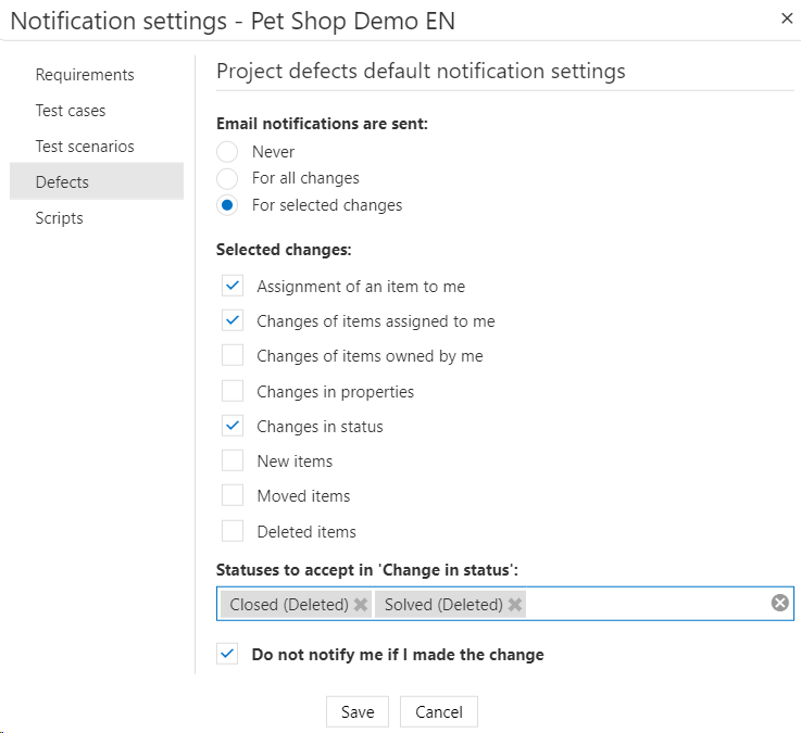 If you select 'Changes in Status' you have the option to define a status. You will then get notifications when items reach that specific status. You can also select more than one status. If you leave the field empty, you will receive an email on any status change. You can also specify that notifications are not sent to the user when changes are made by that user.