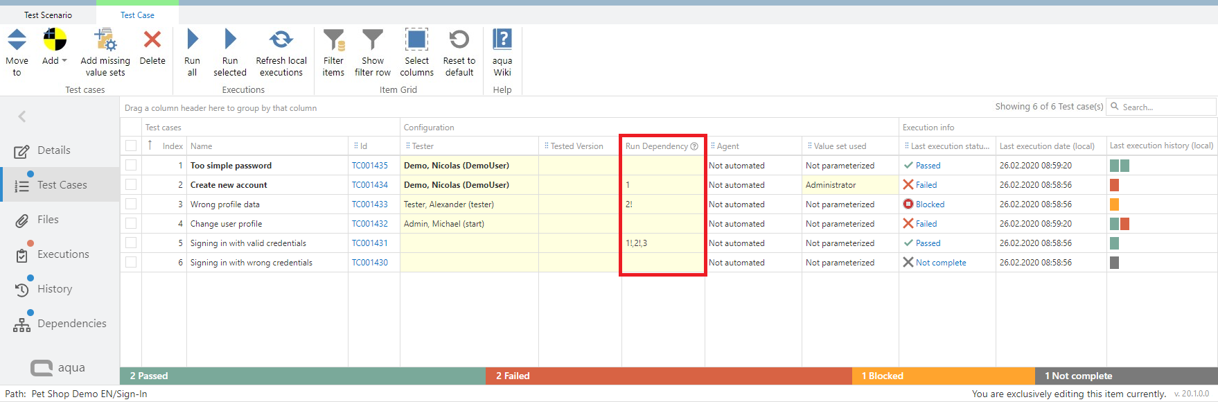 After your test cases are added to the test scenario you can define a run dependency for your test cases. This is for example helpful, if one test case needs to be passed before the next one can be executed. This means that if a single test case failed, none of the other test cases should be executed. To do so add values to Run Dependency column in the test cases view within a test scenario.