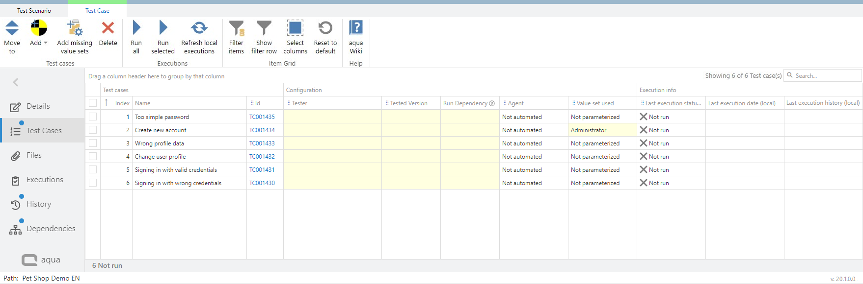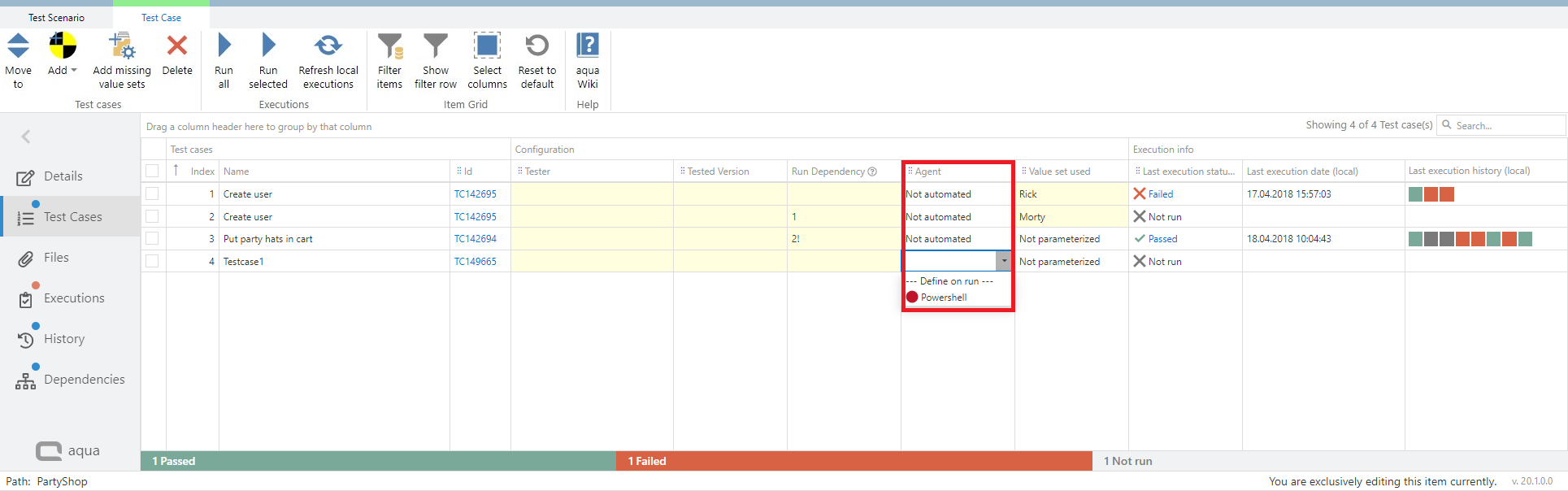 If your test cases in the test scenario are automated you can define an agent for the execution directly in the test scenario. If you do not define an agent here, the agent will be assigned in the execution automatically. aqua allows you to only select an agent which supports the technology the test case is automated with. To define agents, click on 'Test Cases'. Here you find a column 'Agent'. When you click in the cell where you want to define an agent, a drop down appears where you can select the agent. The agent defined in the scenario will be always considered first.