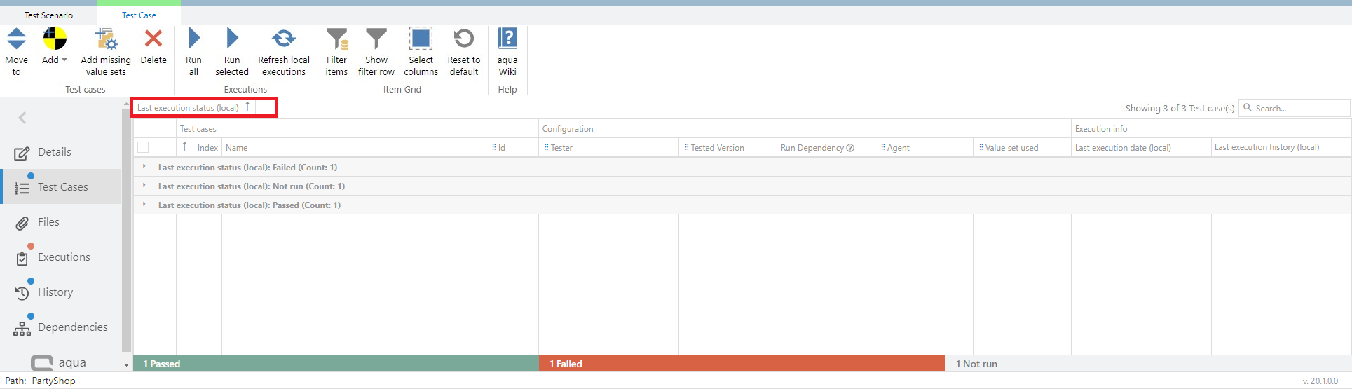 You can also use the search field in the top right-hand corner to search and filter for text strings in the columns. The search applies not only to the Name column but also to the columns Id, Tester, Tested Version, Run Dependency, Agent, Value set used and Last execution status.